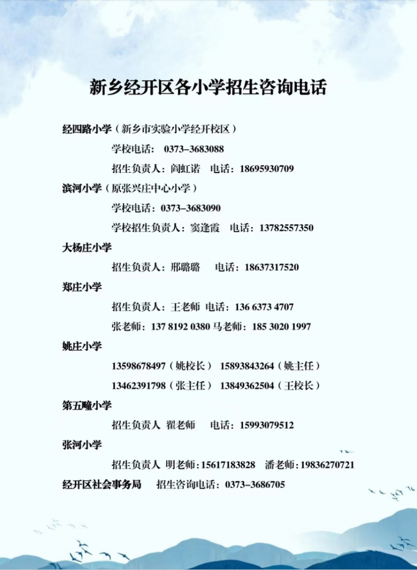 1.经四路小学(新乡市实验小学经开校区):新长大道以北、309省道南北路以东、平原路以南、经十一路(边界路)以西,其中包括:天宝华庭、润华翡翠山、隆基约克郡、新城花园、格林小镇、信合湖畔春天、建业春天里、紫东上苑、孟电观澜壹号、中梁新乐府、云溪九里等小区;樊庄村、李胡寨村、北张兴庄村、贾堤村、位堤村(拆迁安置在樊李社区的)、樊李社区。
