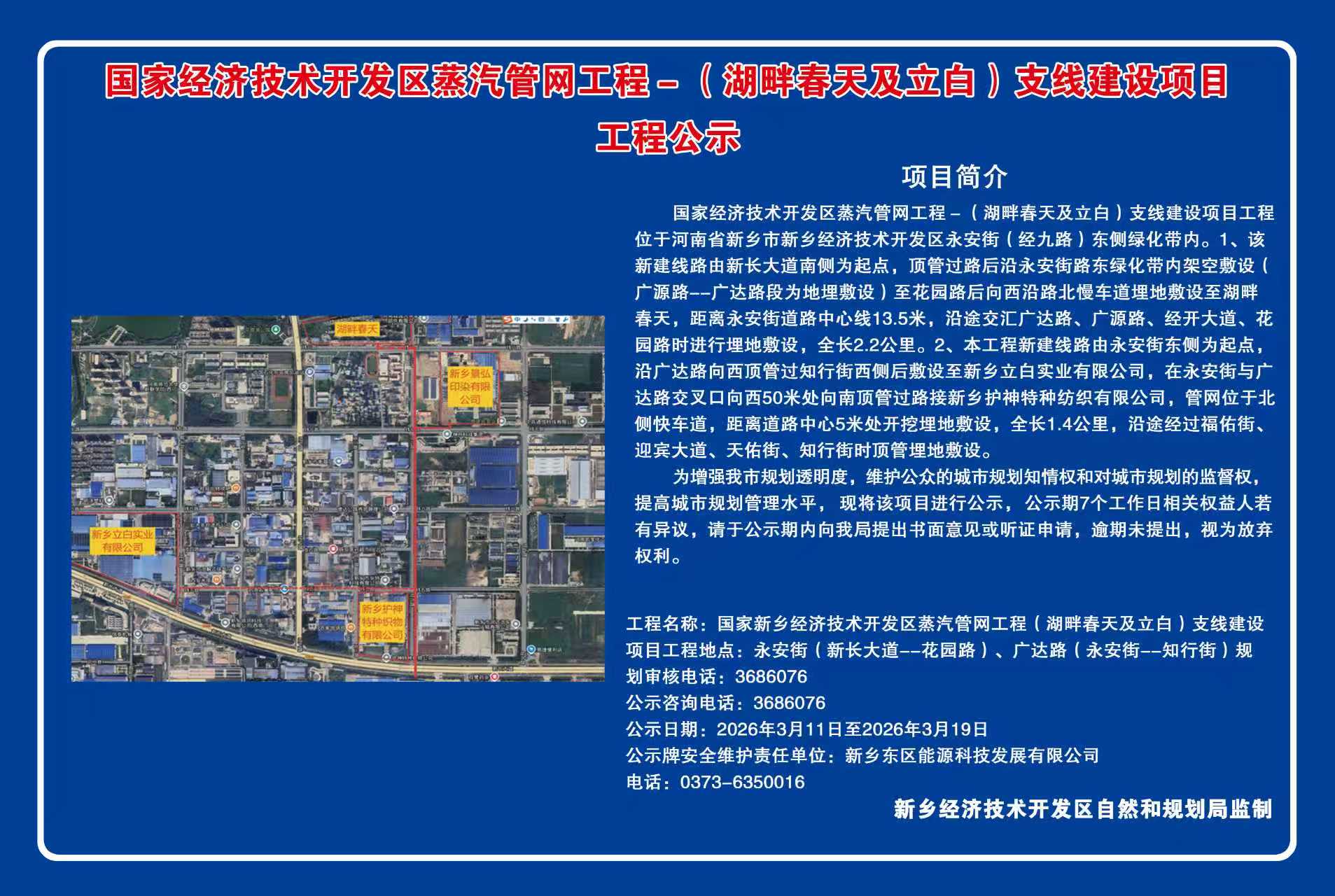 新乡经济技术开发区蒸汽管网工程(湖畔春天及立白)支线建设项目批前公示